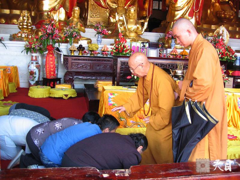 2006年7月12日,师公戒全长老在大理参加崇圣寺开光法会前参观崇圣寺,与老方丈、侍者果佑法师、法子(法师)、果实(出家前的果实法师)居士合影、接受信众顶礼。