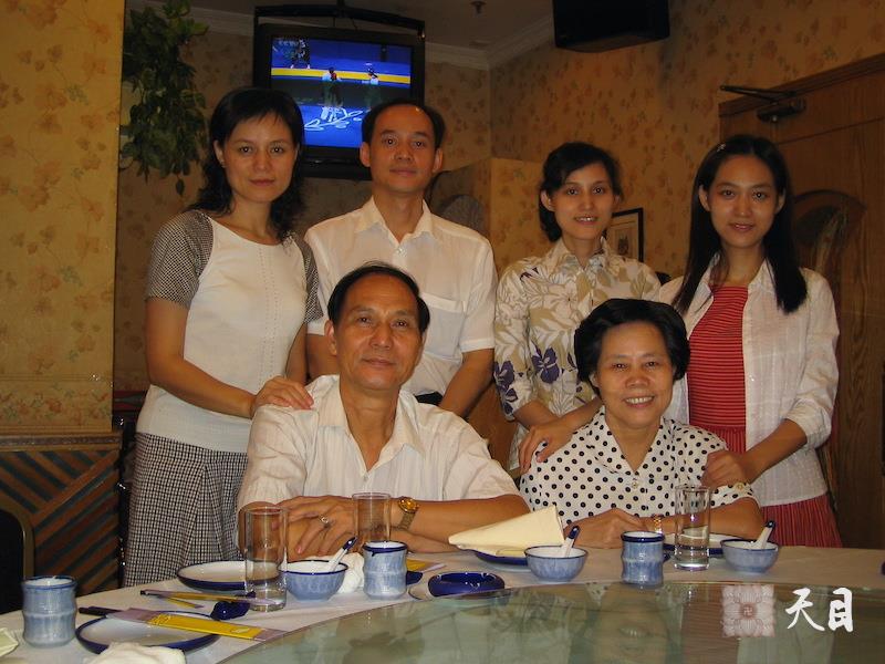 20040828邹宜均(出家前的果实法师)在深圳唐宫祝贺三姐邹芷均考取博士的宴席上和双亲及大姐二哥三姐合影