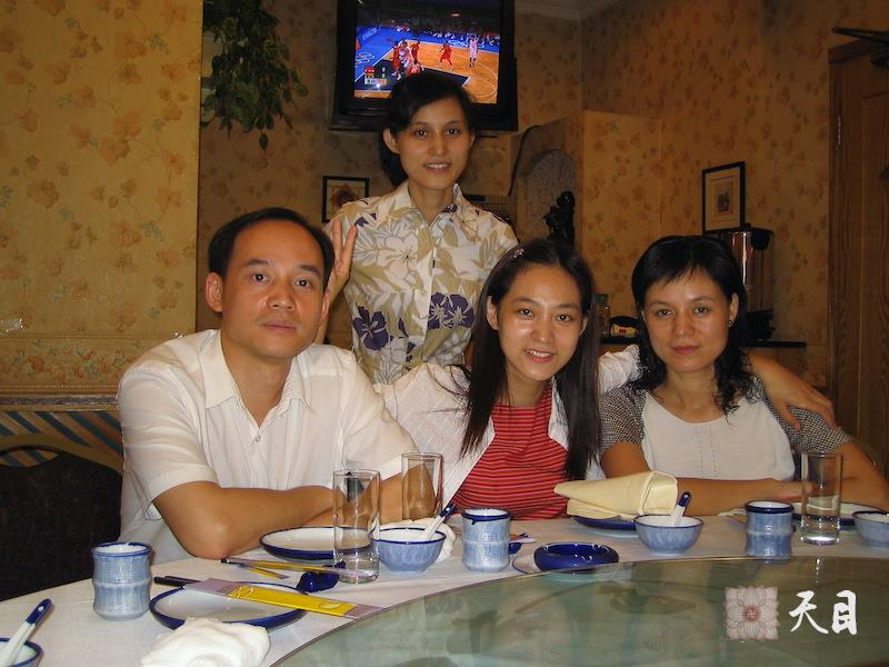 2004年8月28日,邹宜均(出家前的果实法师)在深圳唐宫庆祝三姐邹芷均考取博士的宴席上,和大姐邹宛均二哥邹剑雄三姐邹芷均合影。