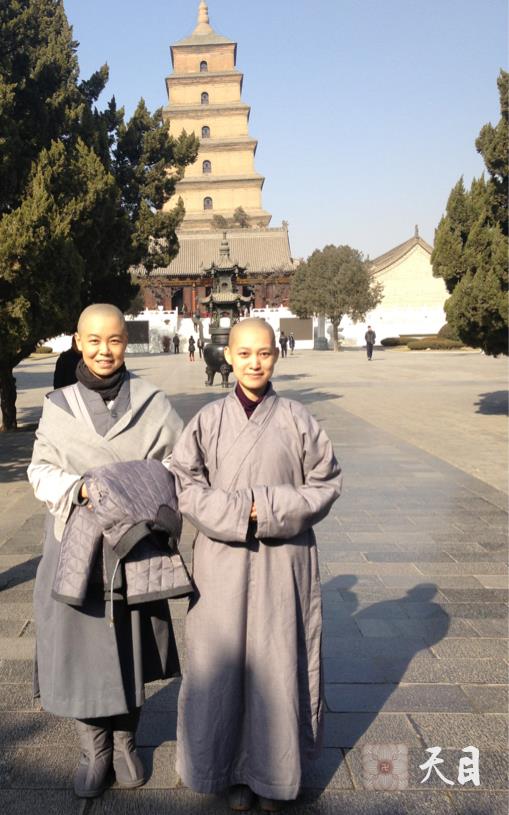 图为果实法师和常智法师在大慈恩寺大雁塔前留影。