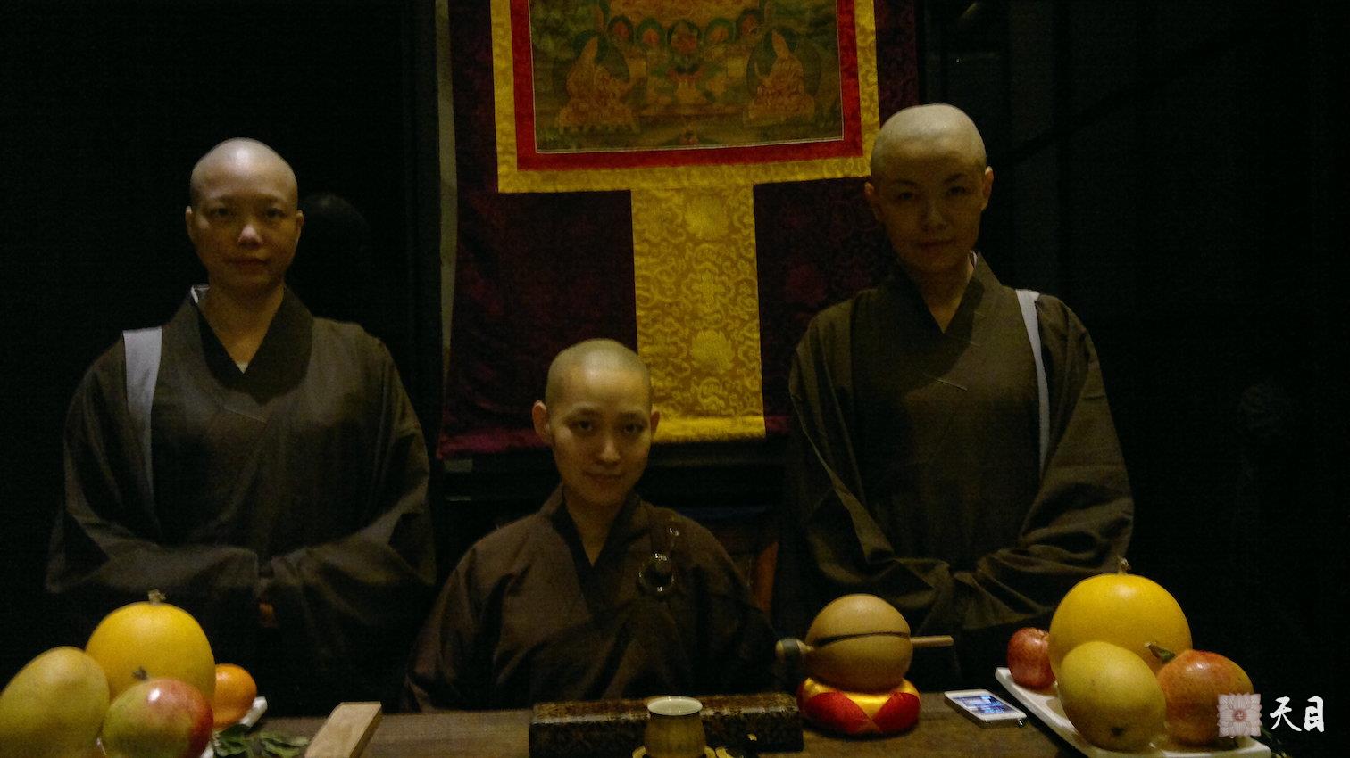 图为果实法师在给果行居士、果林居士举行剃度仪式完毕的合影。