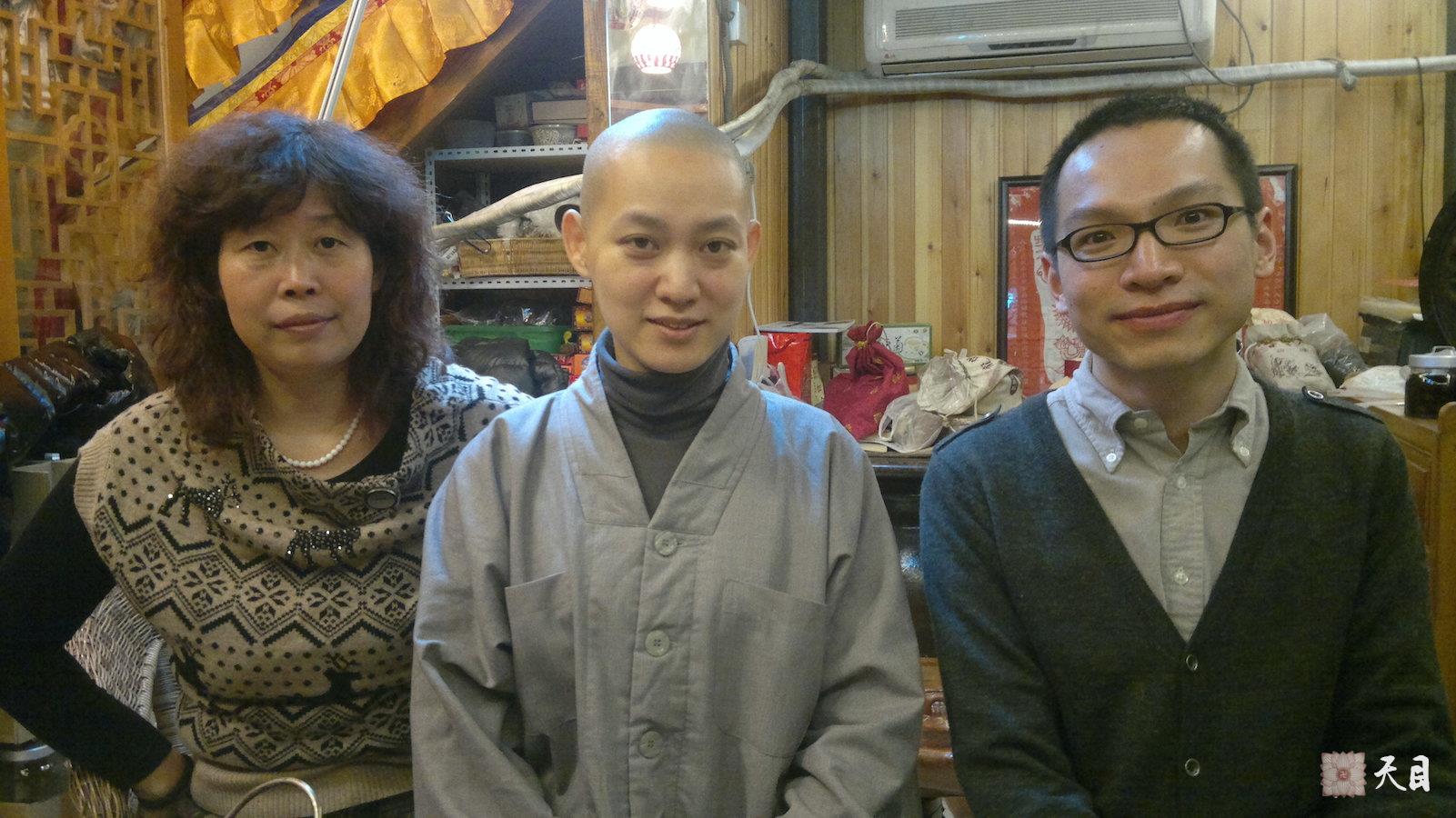 图一:果实法师和常阳居士、郑远涛在北京七宝池素食馆的合影;