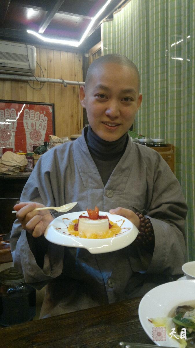 图为果实法师在北京七宝池素食馆吃老板张宜芳居士供养的纯净素生日蛋糕。