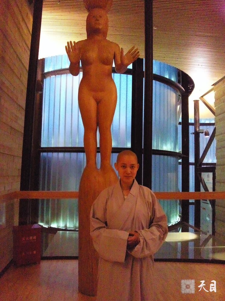 图一:果实法师在上海世博会智利馆女性木雕站立人像前留影;