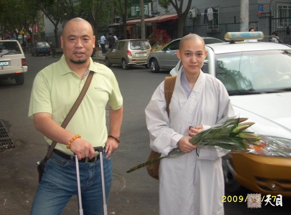 图为果实法师和屠夫(吴淦)居士在北京西直门静思素食馆门口合影。