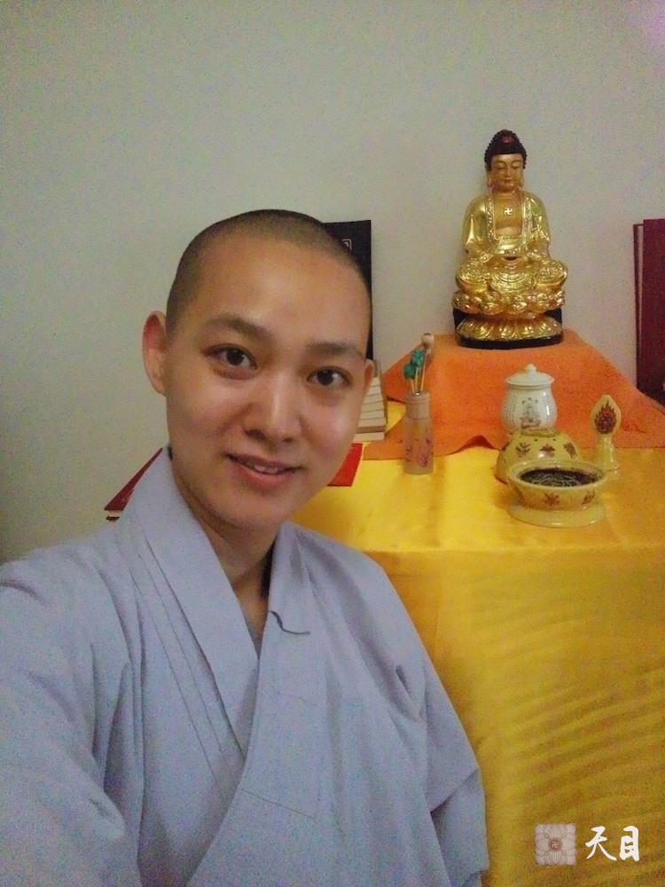 图为果实法师为仰仗恩师圣观法师的法力,讲经前特意在恩师圣观法师广州马赛精舍佛像前自拍。