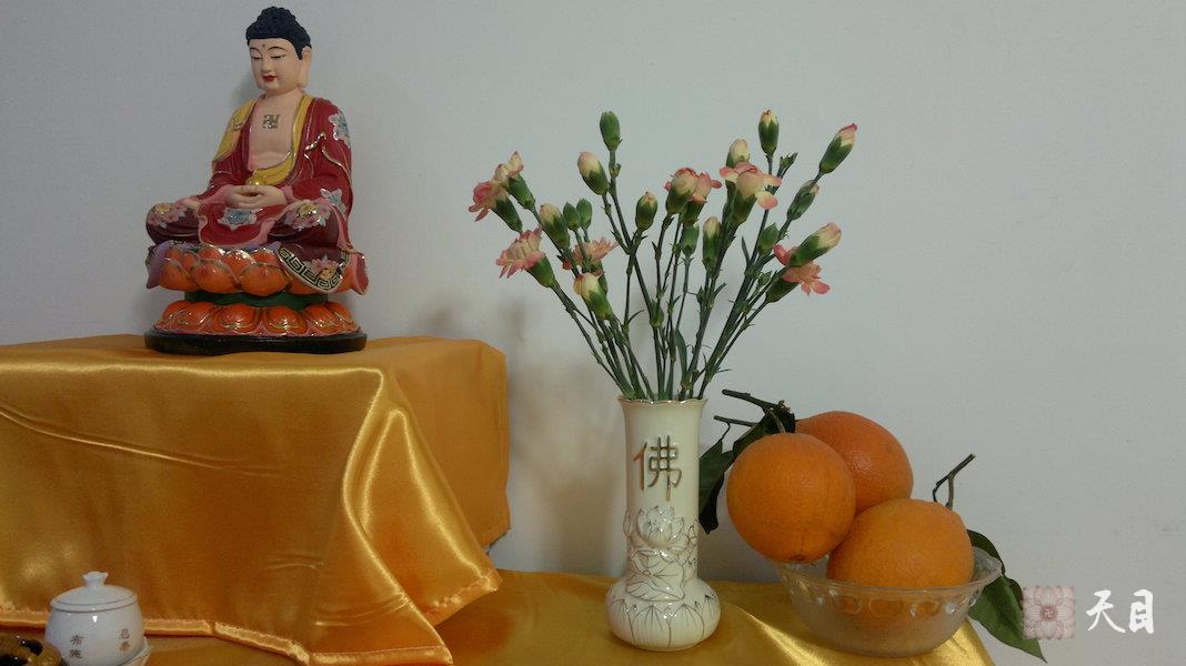 图为2011年2月12日,果实法师驻锡深圳常青居士供养的益田豪园居佛堂期间,常喜居士、常信居士供养的佛像和鲜花。