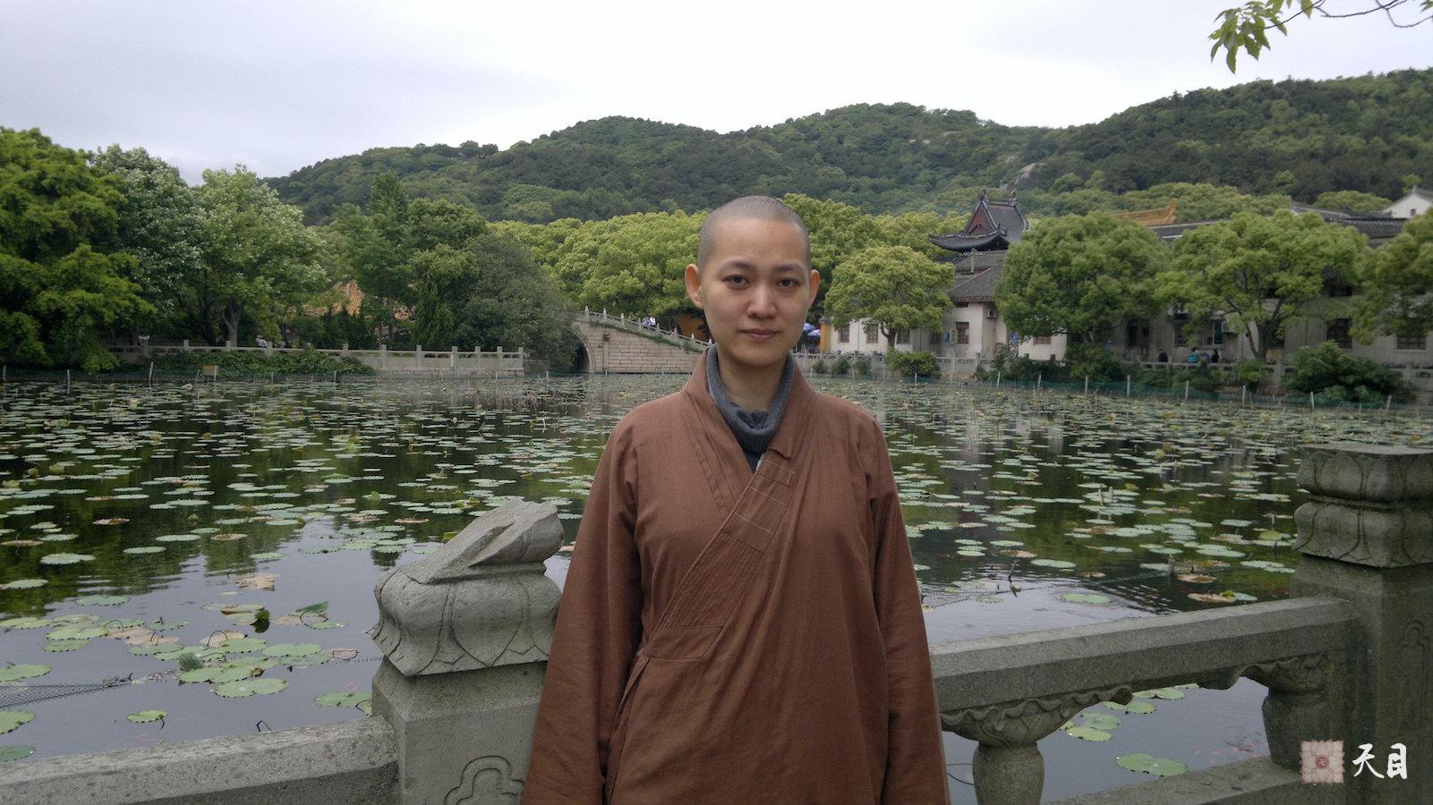 图一:果实法师在普陀山普济寺山门前海印地莲花池边留影;