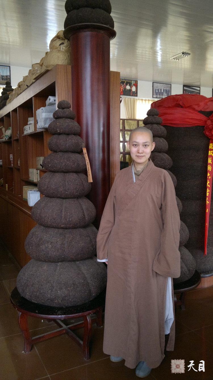 图为果实法师在西双版纳茶博物馆的巨型金瓜贡茶旁留影。