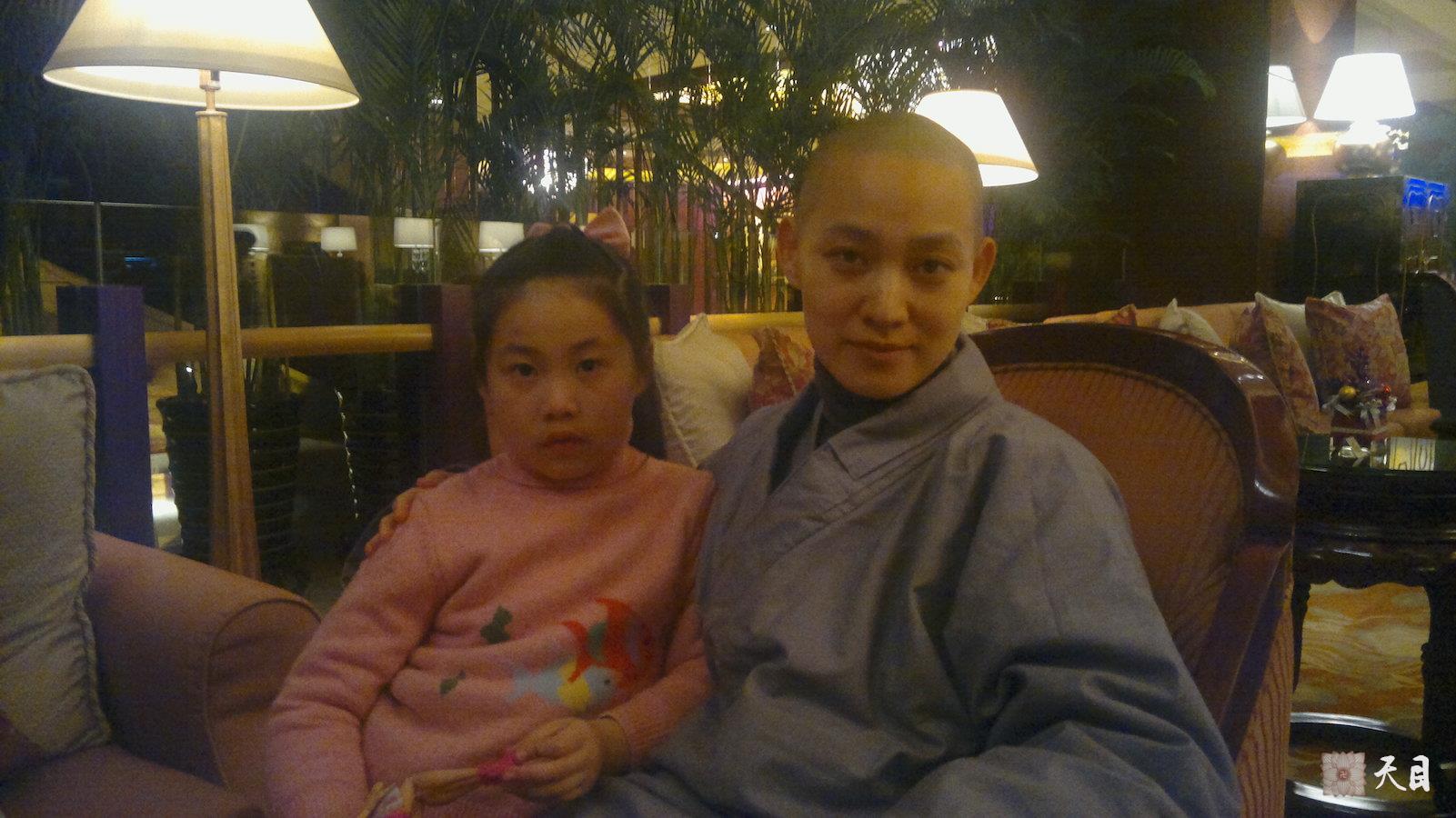 图为果实法师和常无居士的女儿明阅在温州香格里拉大堂吧的合影。