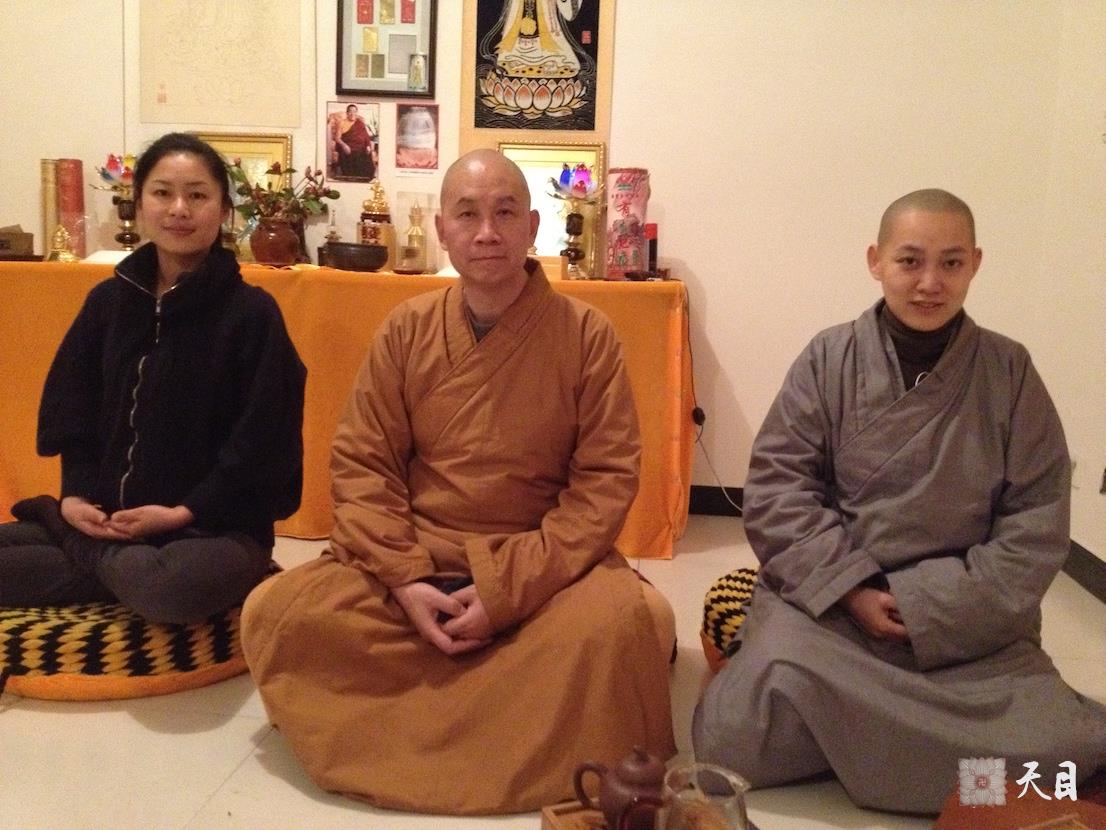图一:恩师圣观法师和果实法师、阿慧李贞慧居士在潘晓阳居士大理古城家的佛堂合影;
