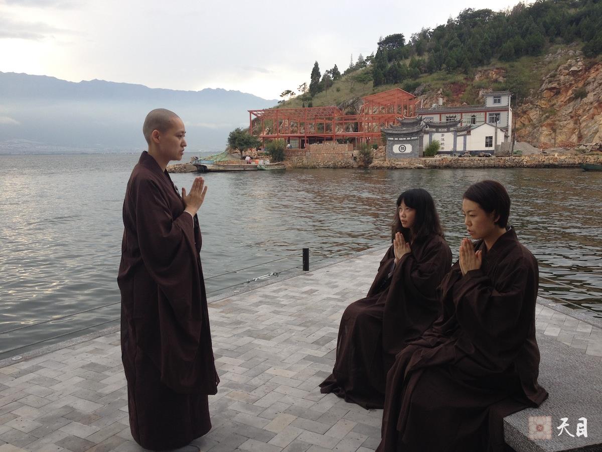 图为果实法师在青朴码头,在苍山洱海的见证下,给果行居士、果林居士举行剃度仪式。
