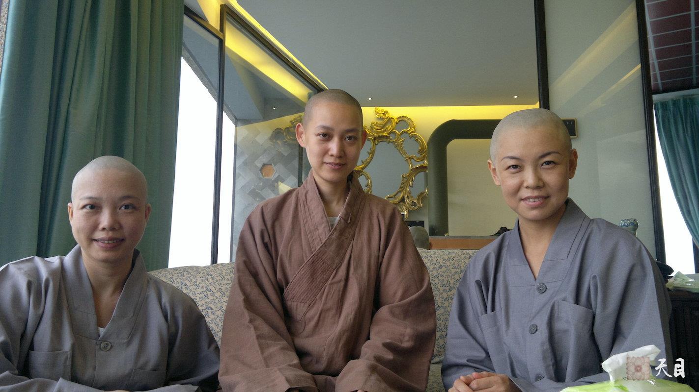 图一:果实法师给果行居士、果林居士举行剃度仪式后在果实法师入住的青朴精品度假酒店大套房内合影;