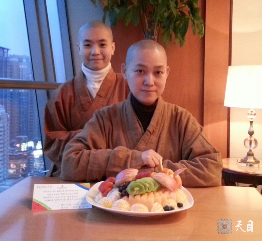 图为果实法师和常香法师在西安香格里拉的合影,以及西安香格里拉给果实法师准备的特别的生日“蛋糕”。