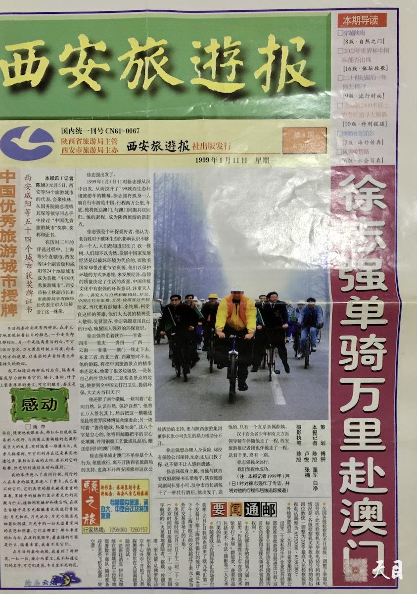 19990111《西安旅游报》题为“徐志强单骑万里澳门”报道在1999年1月1日,徐志强(出家前的圣观法师)自行车单骑万里行从陕西汉中出发!