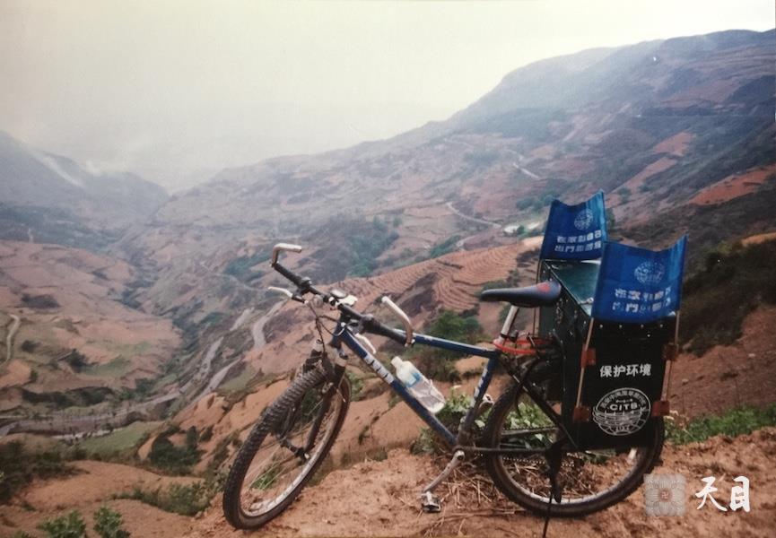 自行车后座上的简单行李箱,装着的就是徐志强(出家前的圣观法师)历时一年的万里单骑的全部行李了,上面印着地球图案和“保护环境、善待地球”的口号。