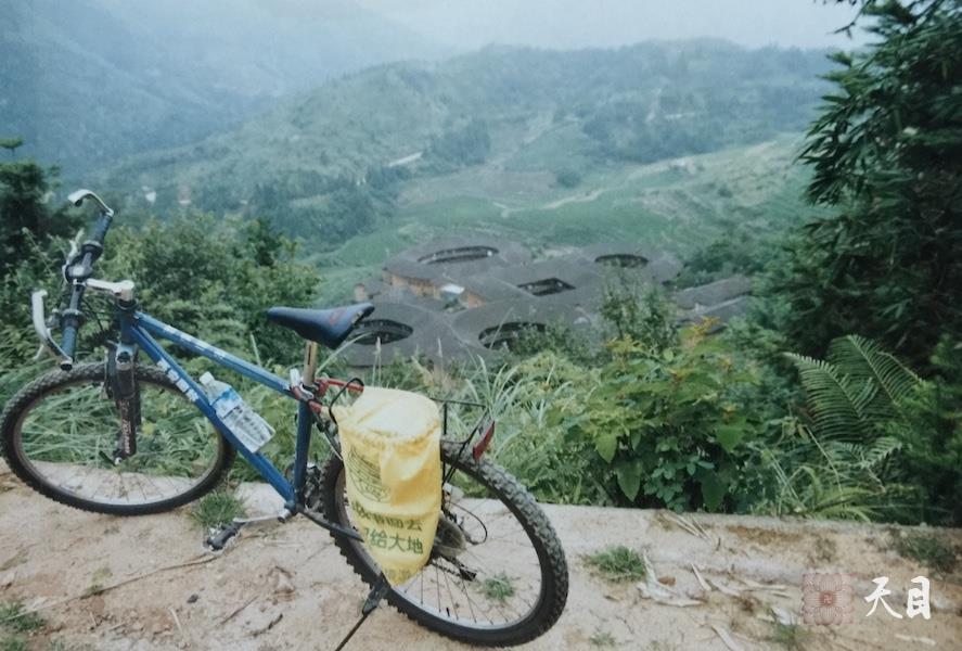 这是1999年7、8月间,徐志强(出家前的圣观法师)骑行至福建境内,经过南靖客家土楼,骑行的自行车(中华大名山地车)。