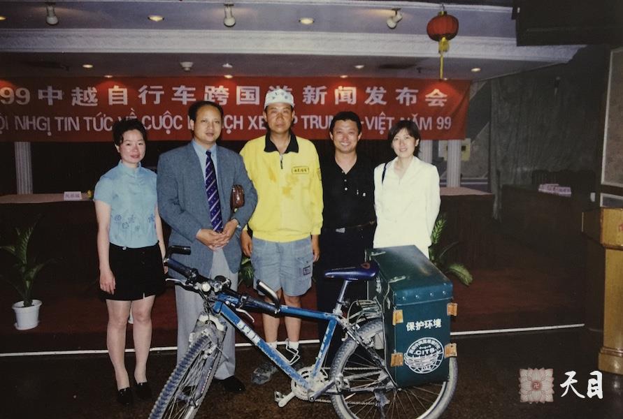 这是1999年6月间,徐志强(出家前的圣观法师)骑行至广西境内,带上他骑行的自行车出席中越自行车跨国游新闻发布会。