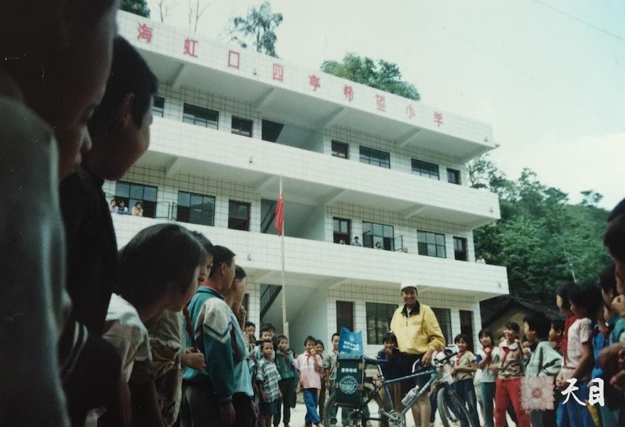 这是1999年5月20日,徐志强(出家前的圣观法师)骑行至云南富宁县,经过上海虹口四亭希望小学时,被当地师生请下来给大家宣传环保知识,并与学生们合影。
