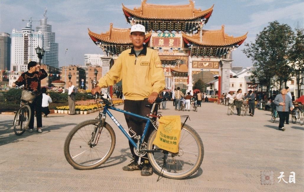 图为徐志强(恩师圣观法师)带上他骑行的自行车在昆明金马碧鸡坊前留影。