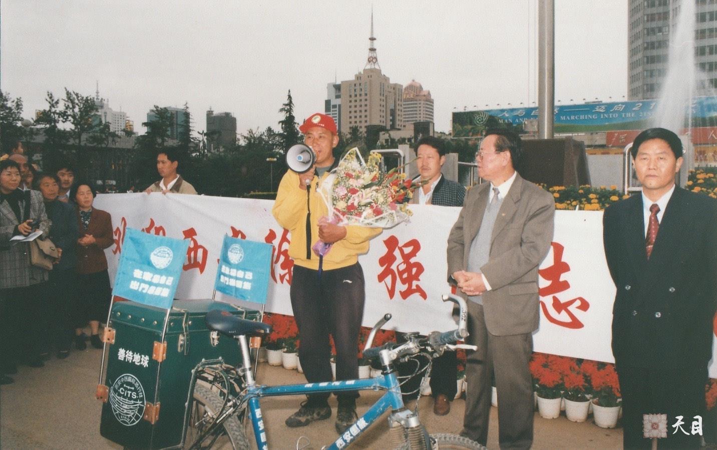 这是1999年5月,徐志强(出家前的圣观法师)骑行至云南昆明,参加1999年昆明世界园艺博览会,昆明世界园艺博览会组委会、云南省政府、云南省旅游局、云南省世博局为徐志强(出家前的圣观法师)这位环保壮士在东风广场举行了盛大的欢迎仪式!徐志强(出家前的圣观法师)也如愿地把已经布满沿途万人签名的10米巨型横幅,“走向自然,认识自然,保护自然”,献给昆明世界园艺博览会组委会,以这种特殊的方式参加世园会、祝贺世园会顺利进行,并带上他骑行的自行车在世园会的生态园门口、园内各景点留影。