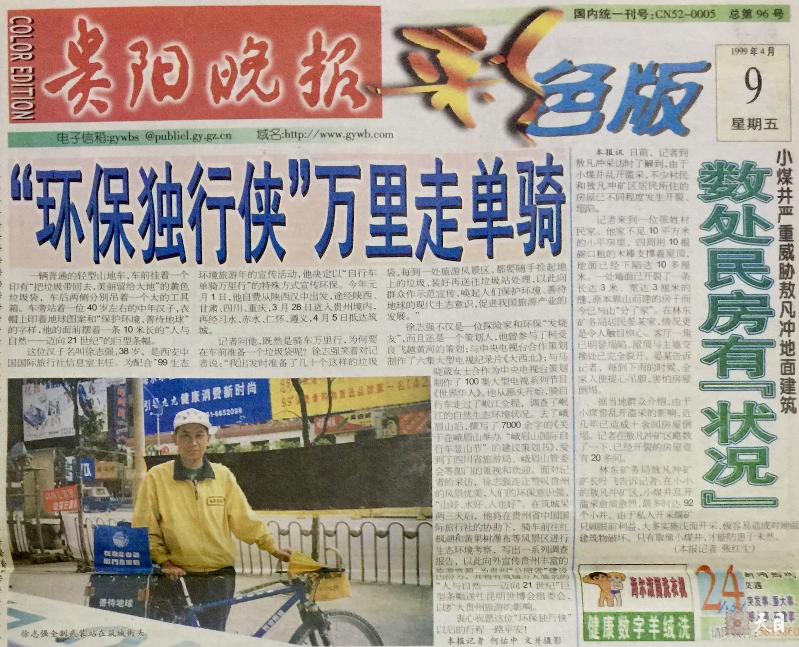 19990409《贵阳晚报》报道徐志强(出家前的圣观法师)“环保独行侠”万里走单骑。
