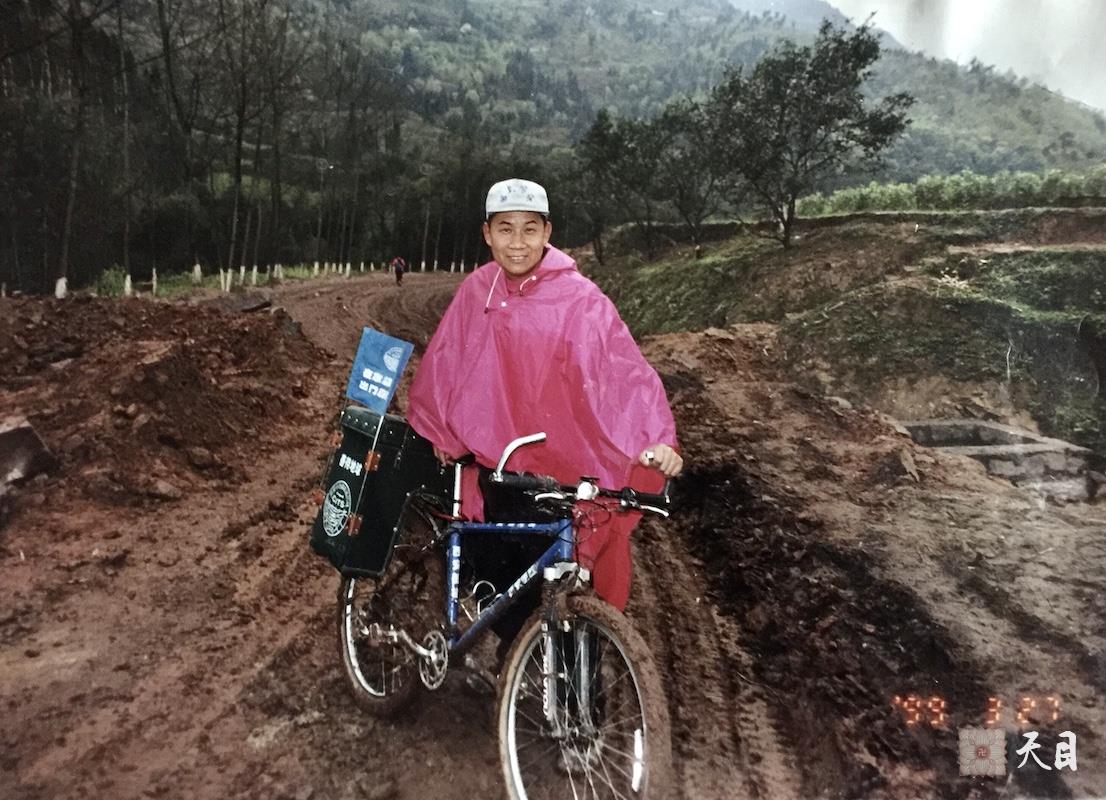 这是1999年3月27日,徐志强(出家前的圣观法师)骑行至重庆四面山景区准备翻过山梁到达贵州大坡,手推着自行车在泞泥中艰难前行。