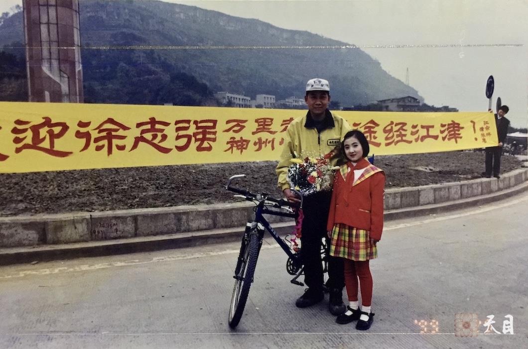 这是1999年3月25日,徐志强(出家前的圣观法师)骑行至重庆江津,获当地政府热烈欢迎,并派学生代表鲜花。