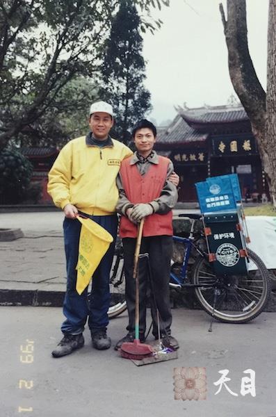 这是1999年2月1日,徐志强(出家前的圣观法师)骑行至峨眉山报国寺时,把他自备的印有“把垃圾带回去,美丽留给大地”字样的垃圾袋拿出来,正打算给报国寺捡垃圾。图为徐志强(出家前的圣观法师)和当地的一名环卫工人合影。