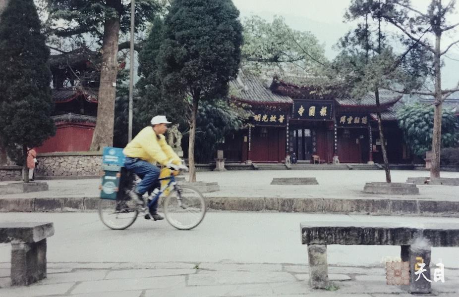 这是1999年2月1日,徐志强(出家前的圣观法师)正骑行至峨眉山报国寺时的照片,印有“保护环境,善待地球”口号的衣服和后座行李箱,格外显眼!