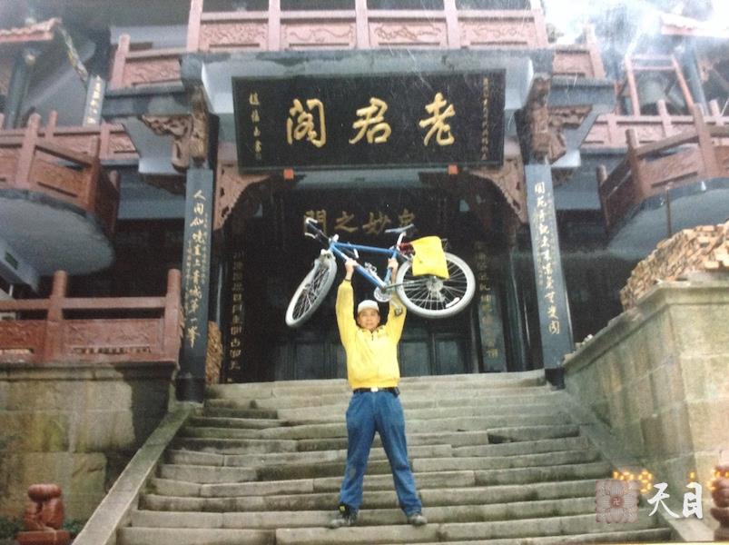 这是1999年1月24日,徐志强(出家前的圣观法师)骑自行车登上位于青城山第一主峰绝顶的老君阁,举起自行车。