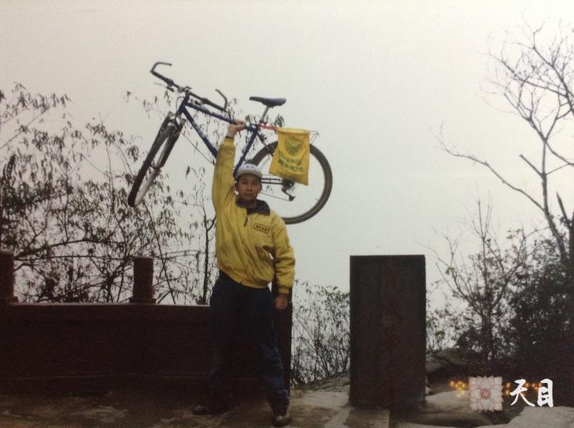 这是1999年1月24日,徐志强(出家前的圣观法师)骑自行车登上青城山第一峰,在“青城第一峯”石碑旁单手举起自行车。