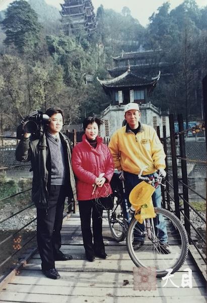 这是在1999年1月23日,徐志强(出家前的圣观法师)骑行至西川境内,到达都江堰,接受当地电视台媒体采访、合影。