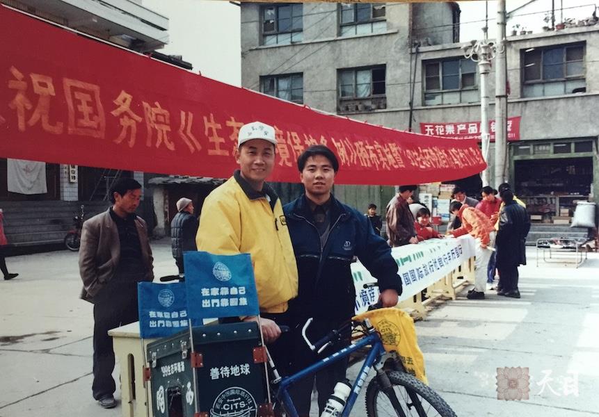 这是1999年1月9日,徐志强(出家前的圣观法师)骑行至甘肃境内,到达陇南武都,拿出那写着“走向自然、认识自然、保护自然”的10米横幅,和当地政府一起在街头宣传环保,请民众签名,并耐心解答大家的咨询。