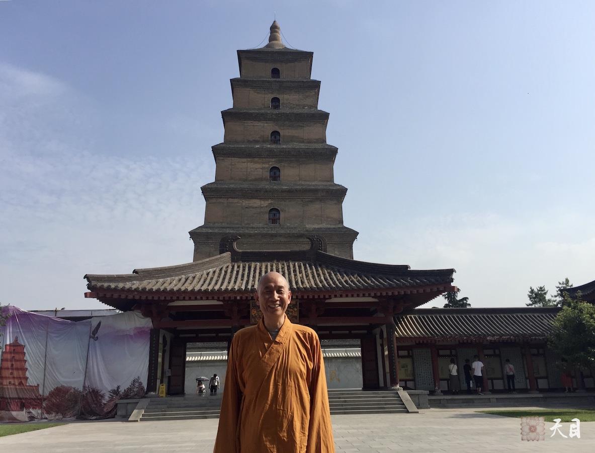 图一:恩师圣观法师在西安大慈恩寺大雁塔玄奘三藏院前留影;