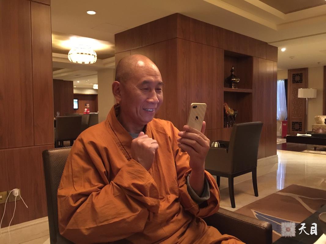 图为恩师圣观法师给大家开示、以及接到来自澳大利亚悉尼的果贞居士、心平居士电话的情景。