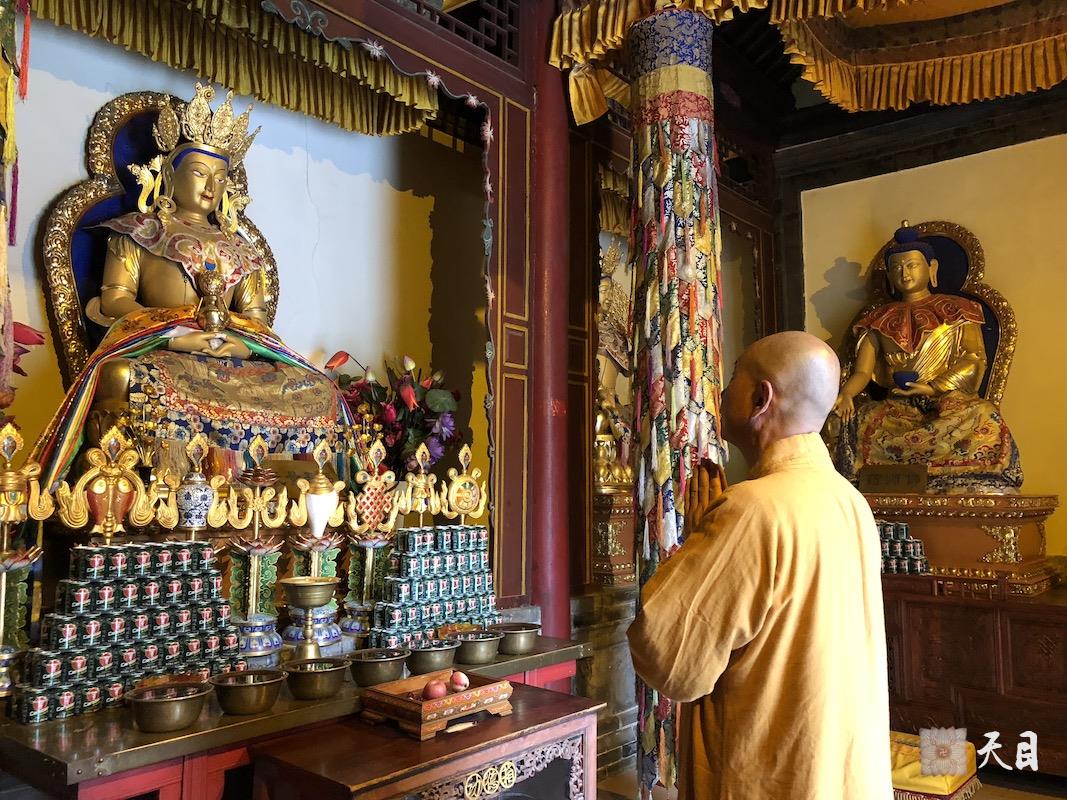 图为恩师圣观法师来到匾额《庄严佛土》为康有为1923年参访广仁寺时题写的、主供无量寿佛的长寿殿内,礼拜无量寿佛,并在长寿殿前和果实法师、常香法师、常彩居士合影。
