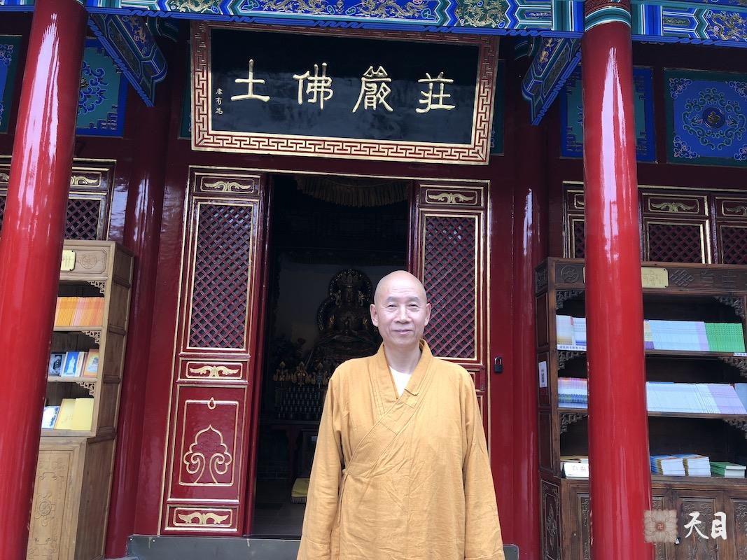 图为恩师圣观法师来到匾额《庄严佛土》为康有为1923年参访广仁寺时题写的、主供无量寿佛的长寿殿内,礼拜无量寿佛,并在长寿殿前和果实法师、常香法师、常彩居士合影。
