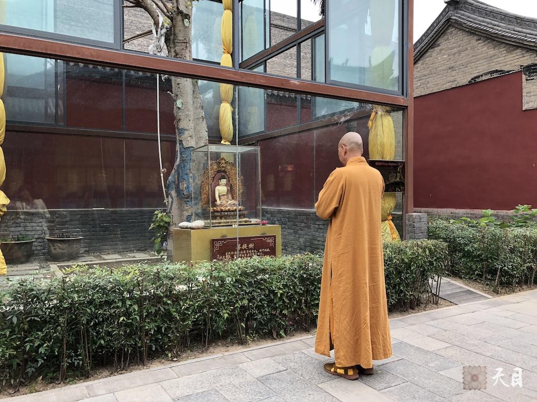 图为恩师圣观法师在广仁寺绿度母殿西侧的一株百年菩提树前。佛教一直都视菩提树为圣树,印度将之定为国树,这株菩提树就是从印度菩提伽耶迎请移植而来的。这株菩提树是2014年从印度菩提伽耶迎请移植而来的,长途跋涉2000多公里,耗时三年才来到广仁寺,所以这棵菩提树不光很有佛学价值而且极其珍贵。也正因为它如此珍贵,所以为了让其适合陕西的气候、环境,植物学家专门为其造了一个“玻璃房子”,希望这株菩提树能真正“扎根”西安。