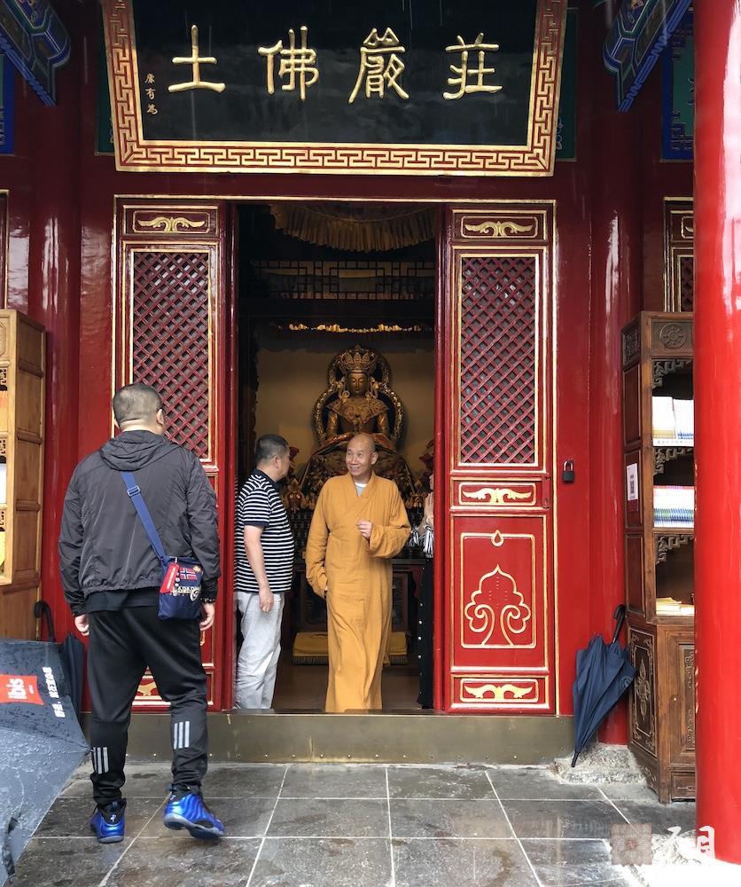 图为恩师圣观法师带领心一居士、果珍居士、常彩居士、常惠居士、心婵居士从匾额《庄严佛土》为康有为1923年参访广仁寺时题写的、主供无量寿佛的长寿殿内,礼拜无量寿佛结束,走出长寿殿。
