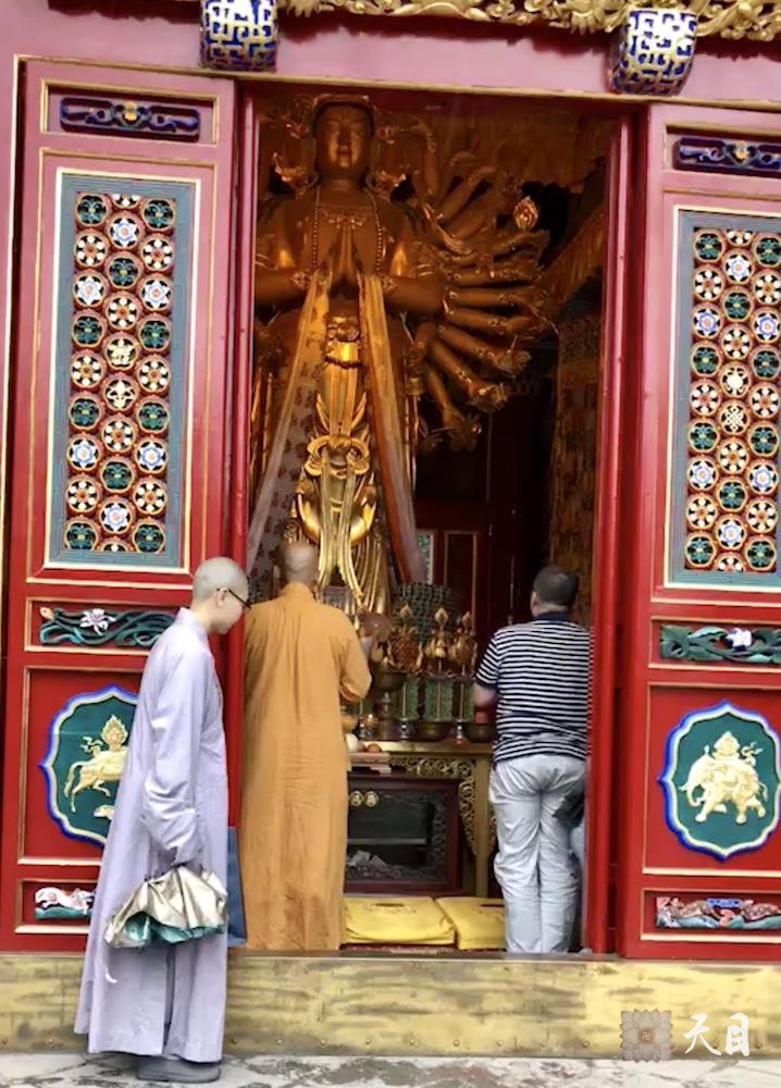 图为恩师圣观法师带领果实法师、常香法师、心一居士、果珍居士、常彩居士、常惠居士、心婵居士依次来到天王殿礼拜千手观音、千佛殿礼拜宗喀巴大师像。广仁寺千佛殿是中国唯一的精品千佛殿,正门上悬挂由慈禧太后题写的匾额《法相庄严》,主供着藏传佛教创立者宗喀巴大师像以及两位高徒贾曹杰和克珠杰,即第一世达赖喇嘛和班禅大师像。