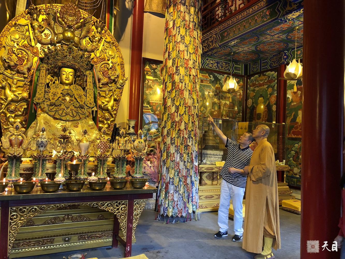 图为恩师圣观法师带领果实法师、常香法师、心一居士、果珍居士、常彩居士、常惠居士、心婵居士来到藏经阁内礼拜释迦牟尼佛和释迦牟尼佛的十二岁等身佛像坐的汉白玉莲花宝座、瞻仰释迦牟尼佛真身骨舍利。