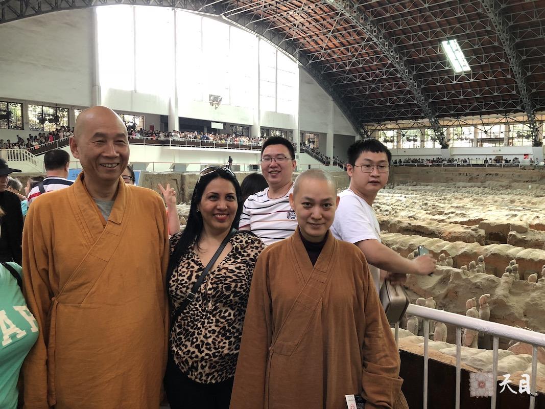 图为恩师圣观法师带领果实法师、常香法师、心一居士、果珍居士、常彩居士、果音居士、常惠居士、心婵居士等弟子走进秦始皇兵马俑博物馆,穿过诺大的广场,来到到兵马俑一号坑展厅,给大家讲解,应外国游客请求合影。