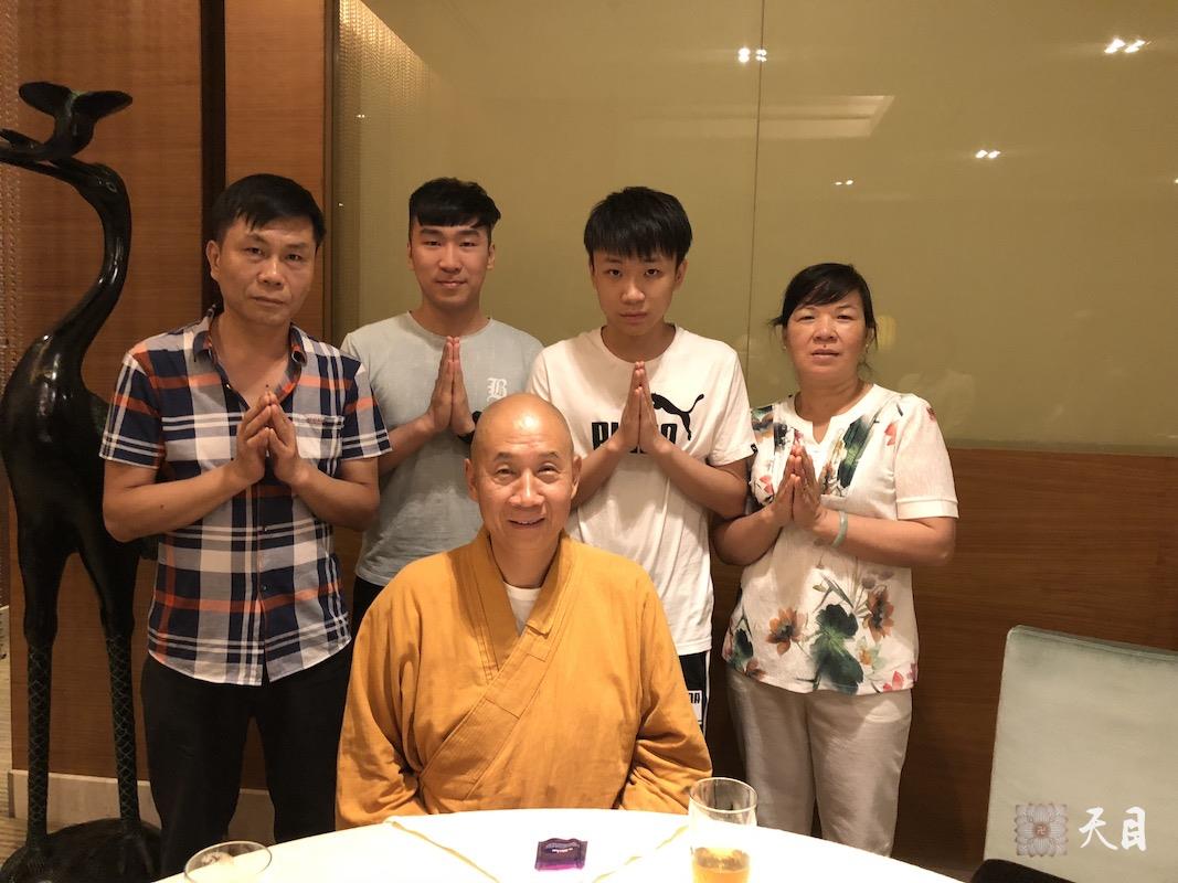 图为恩师圣观法师与果音居士、心观居士一家的合影。