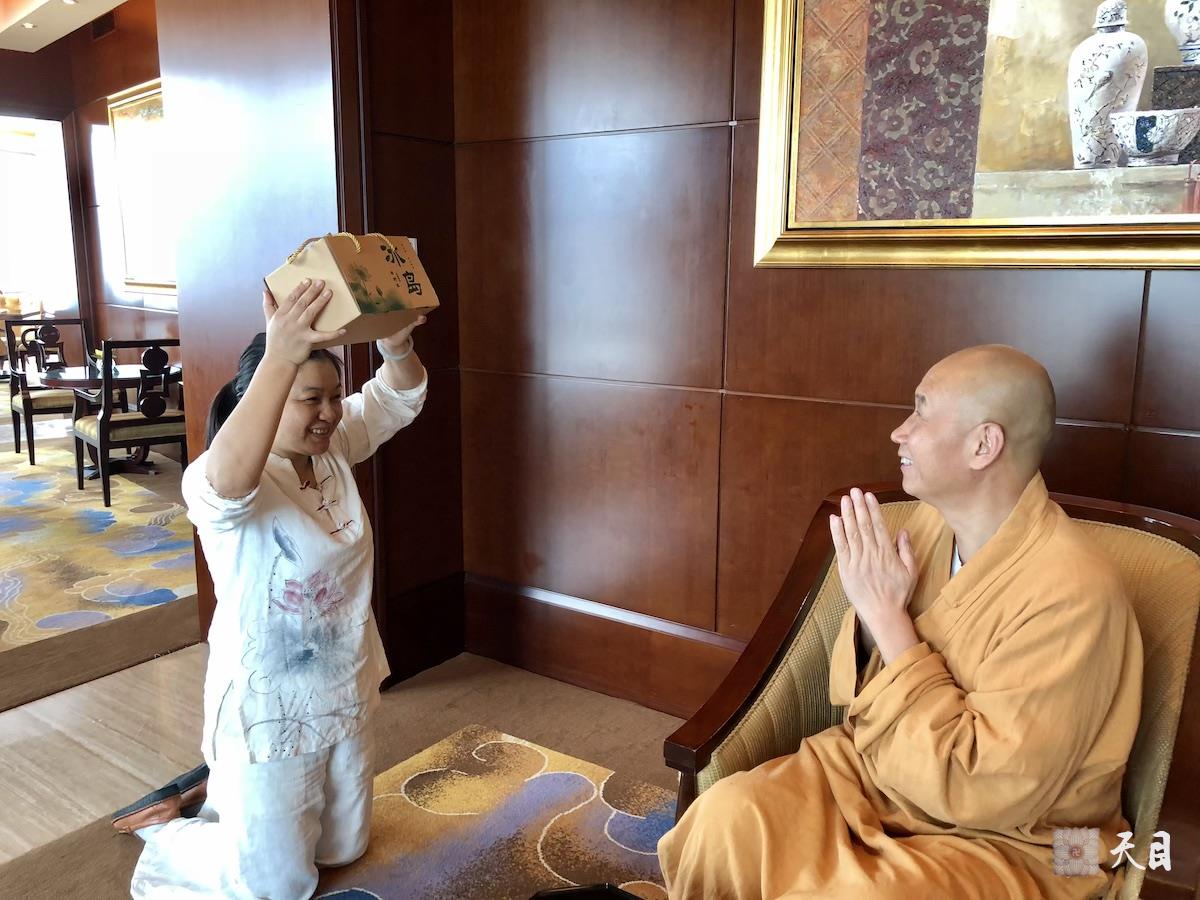 2018年6月30日,恩师圣观法师在温州弘法期间,常顺居士前来温州香格里拉豪华阁行政酒廊顶礼亲近恩师圣观法师,图为常顺居士给恩师圣观法师供养冰岛古树茶。