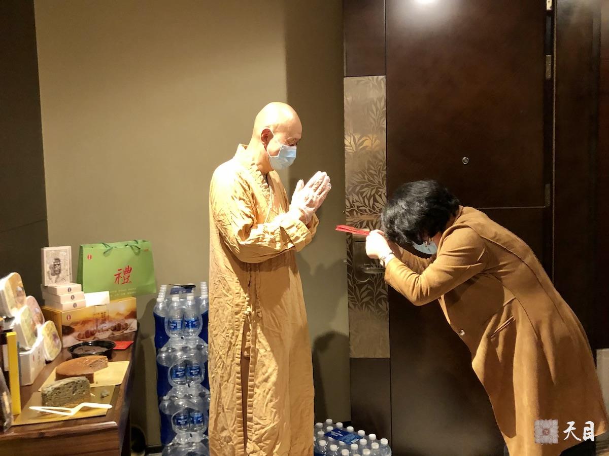 2020年12月29日,恩师圣观法师在广州粤海喜来登道场3216房间的门厅,和果实法师等前来祝寿的弟子在一起。恩师圣观法师非常慈悲、非常智慧,为了大家的安全,生日也不忘严格遵守社交距离,还特别叫弟子们不要顶礼。而住在广州粤海喜来登道场3201房间的果实法师,自疫情爆发以来,为了更好地护持患有高血压、糖尿病、心脏病等基础疾病的恩师圣观法师,除了仅仅为给恩师圣观法师准备餐食才离开自己3201房间过去恩师圣观法师3216房间(恩师圣观法师3216房间有大厨房方便加热蒸煮消毒食物)外,果实法师没有去过其他地方,没有进过电梯,没有下过楼,处于闭关状态,到了恩师圣观法师生日这天,果实法师已闭关近一年,为给恩师圣观法师祝寿才首次和居士见面交流。