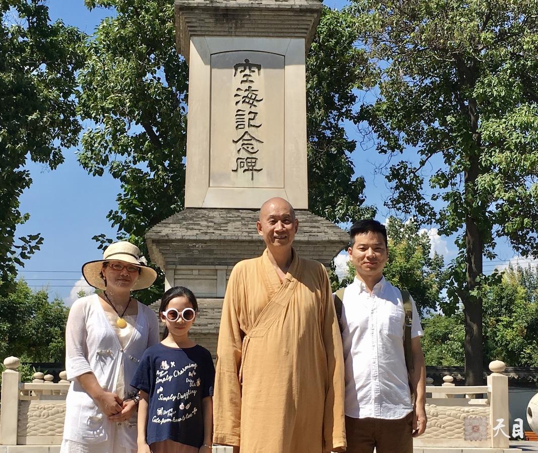 图一、二:恩师圣观法师和常珍居士、常清居士、常俊居士、常彩居士在青龙寺空海法师纪念塔前合影、