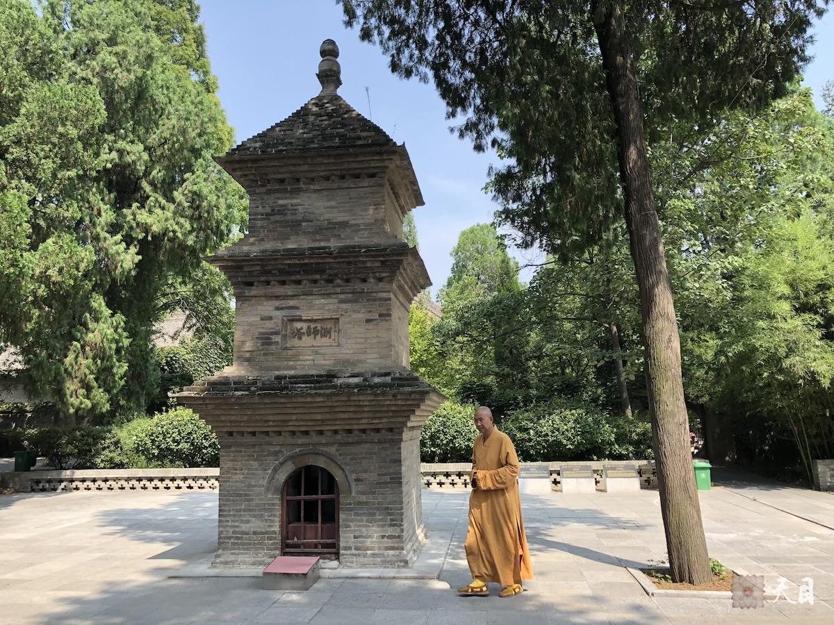 图为恩师圣观法师在圆测法师的舍利塔前绕塔。