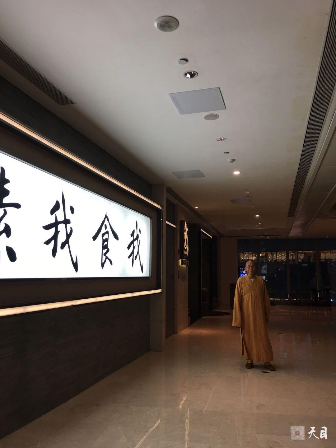 图为恩师圣观法师在广州我食我素素食馆应供结束走出来。