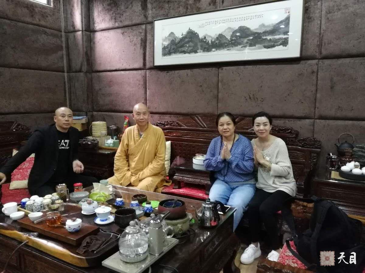 图为恩师圣观法师在常曦居士贵阳的清和茶庄开示《普贤菩萨行愿品》的情景、和常曦居士、常顺居士、常发居士合影。